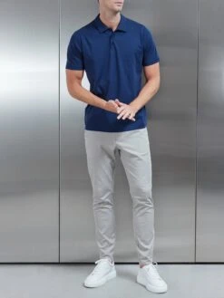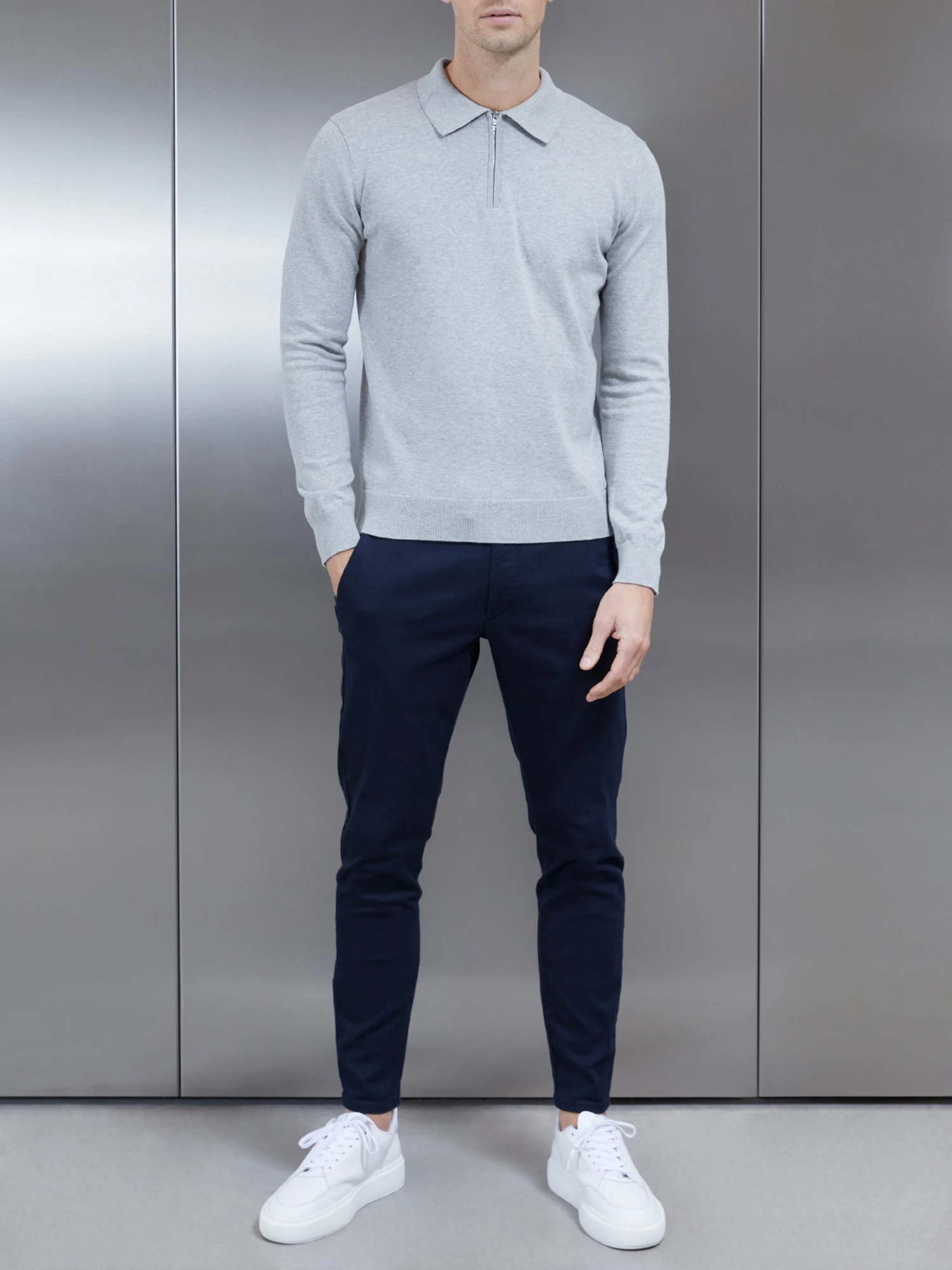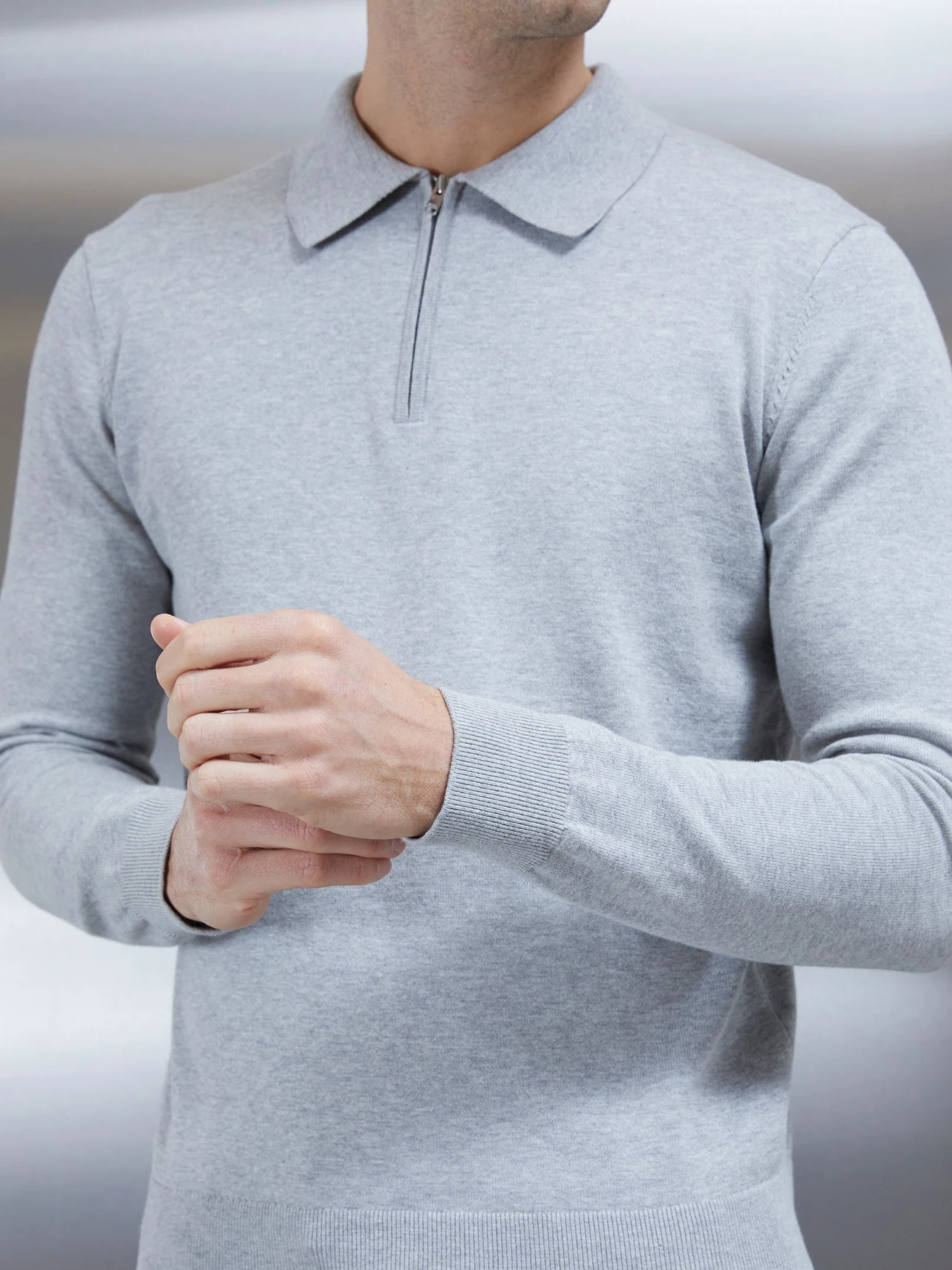 Cotton Knitted Long Sleeve Half Zip Polo Shirt In Marl Grey