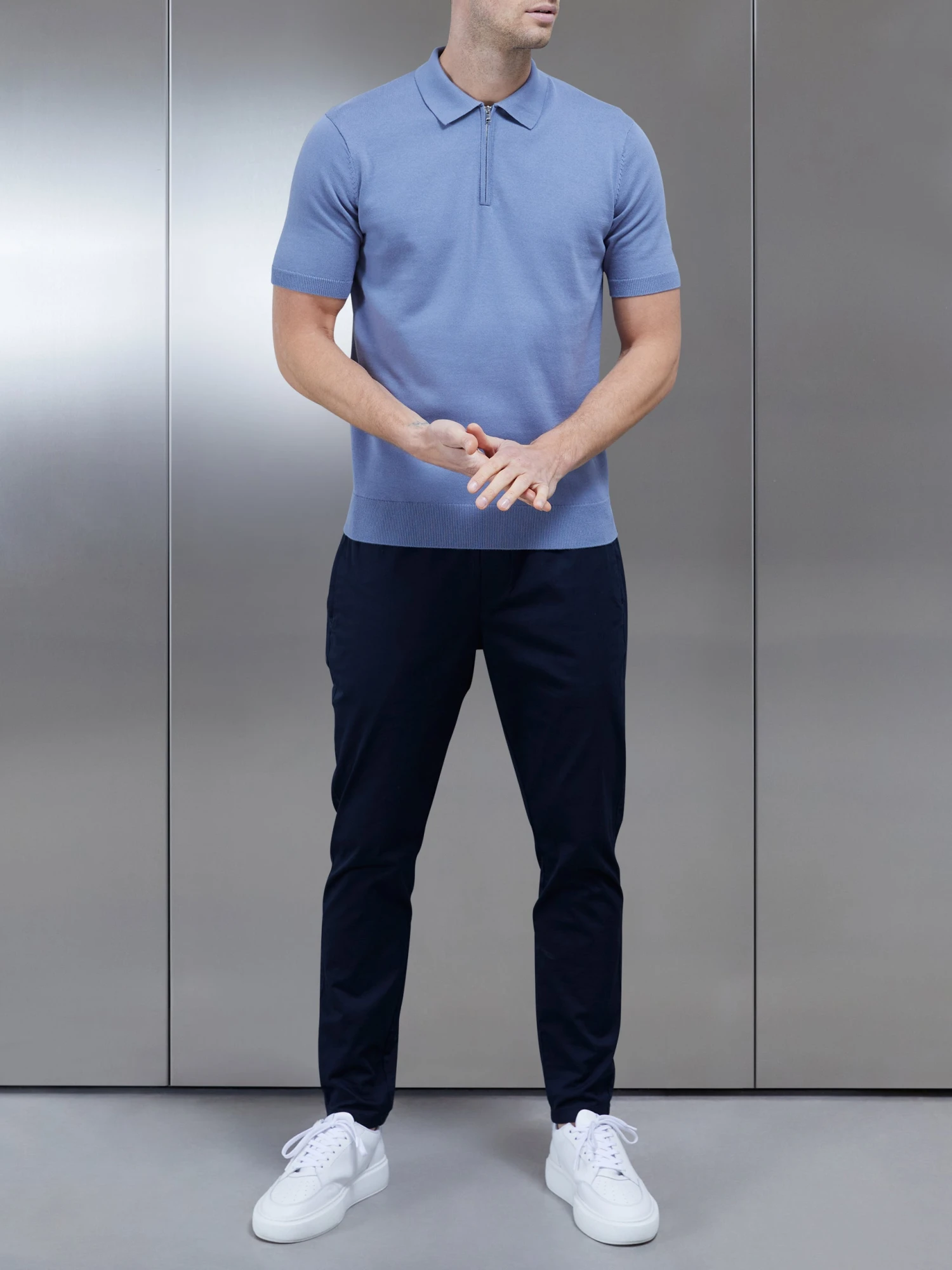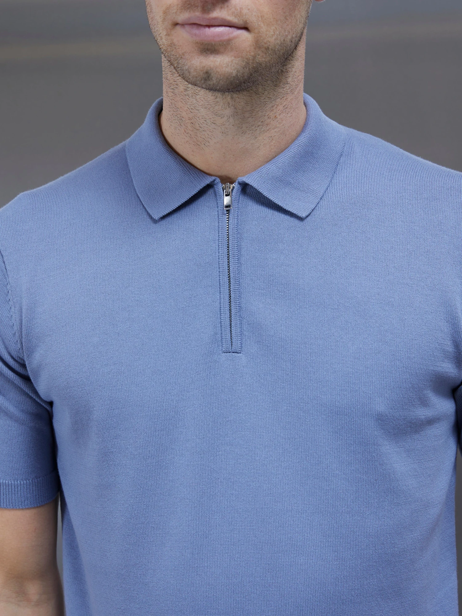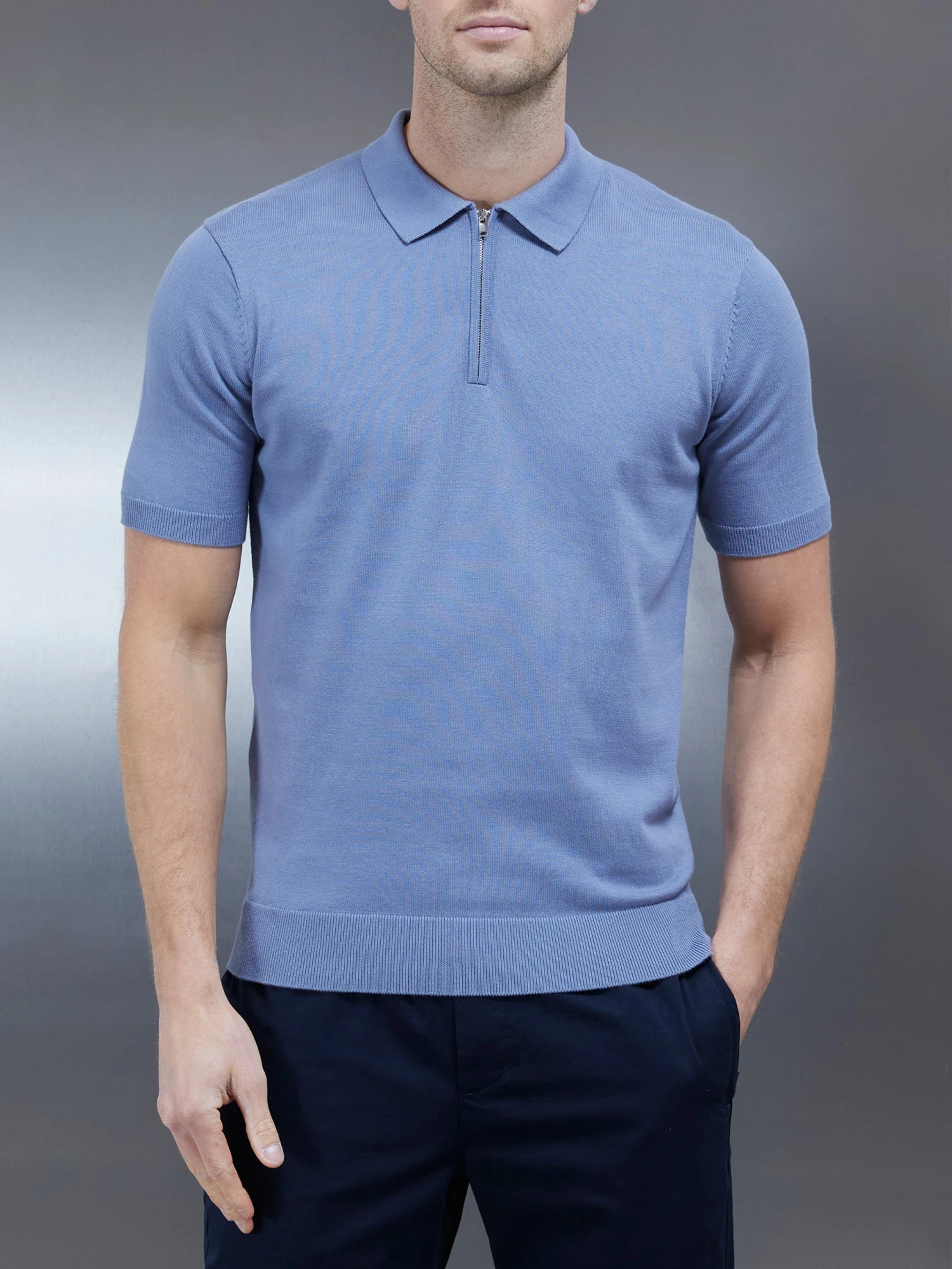Cotton Knitted Zip Polo Shirt In Silk Blue