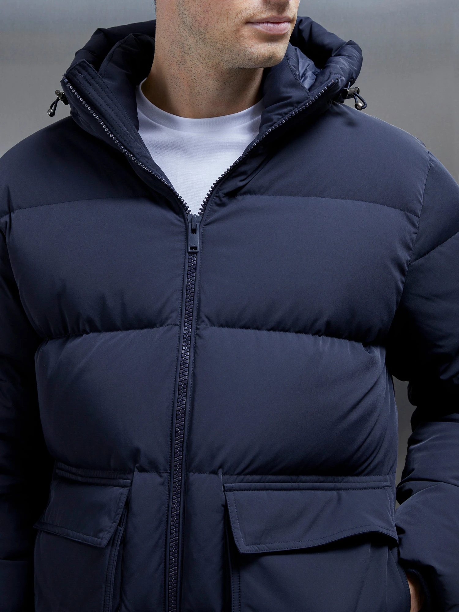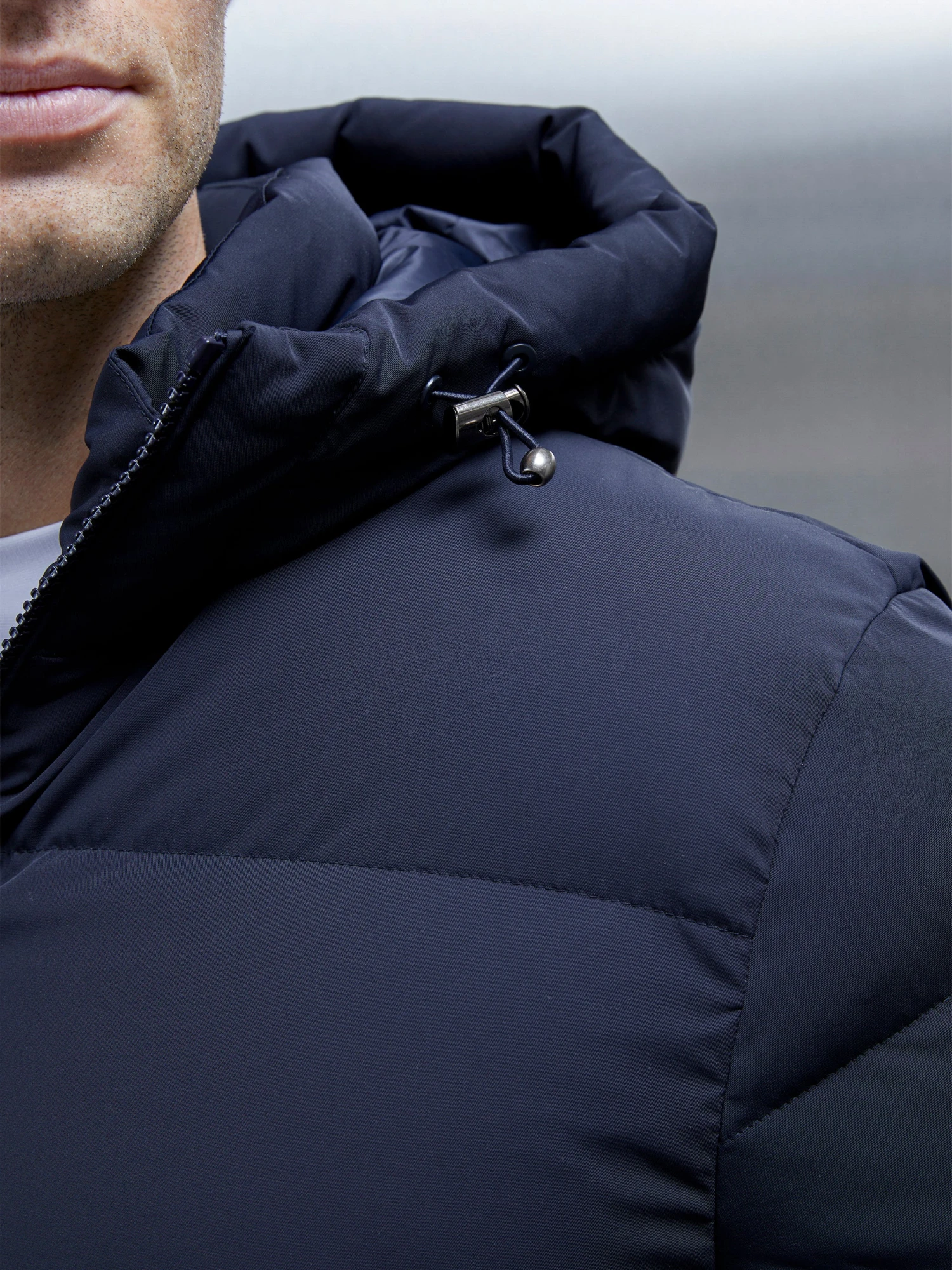 - Fixed hood with external adjustable elastic drawcord pulls